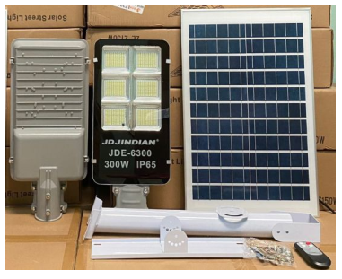 | JDE-6300 | Công suất: 300W Kích thước đèn: 495*210*70mm Số lượng mắt LED 360 LED Thời gian chiếu sáng 10-12h Diện tích chiếu sáng: 350m2 Dung lượng pin: 30.000mah Chất liệu tấm pin: Poly tuổi thọ 10-12 năm Điện áp đầu ra 6V35W Thời gian sạc pin 4-6h Bộ sản phẩm bao gồm: Đèn + điều khiển từ xa + tấm pin năng lượng mặt trời + cần gắn đèn |